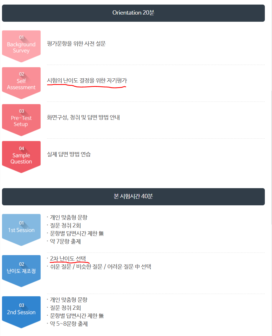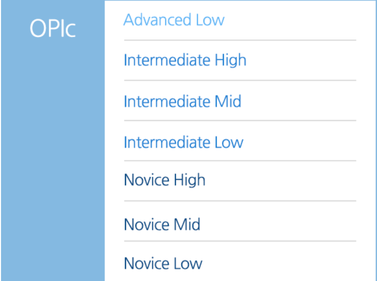 - 평가등급: Novice Low ~ Advanced Low (Intermediate Mid 등급만 IM1 < IM2 < IM3 와 같이 세분화함)