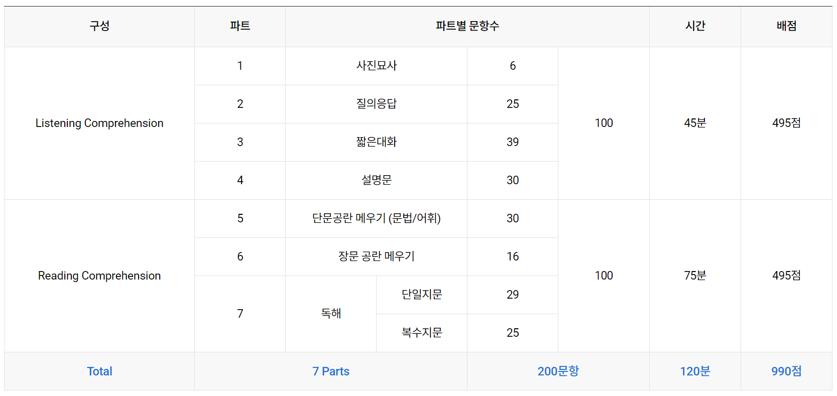 - 시험 점수: RC(Reading Comprehension)와 LC(Listening Comprehension) 각각 495점씩 총 990점 만점.
