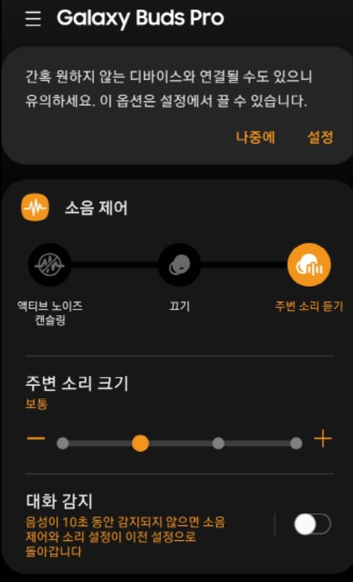 음악을 듣다가 옆에 있는 사람에게 말을 걸고 싶을 때 대화 감지 기능이 켜져 있다면 자동으로 상대방의 말을 들을 수 있게끔 주변 소리 듣기 모드가 작동하고 음악 소리도 내려가게 되는 거죠.
