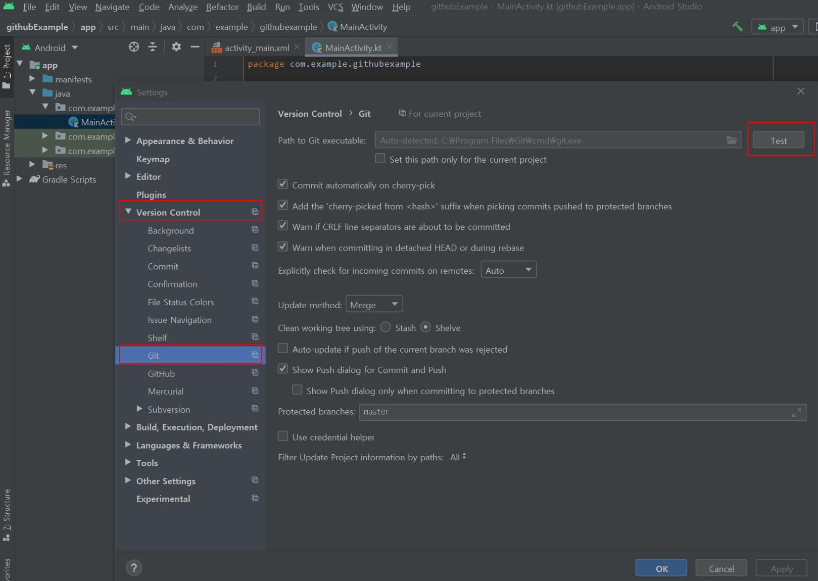 아래 사진에서 빨간 네모로 표시해 둔 Test를 클릭하면 현재의 깃 버전을 알 수 있고 실행 테스트를 할 수 있게 된다.
