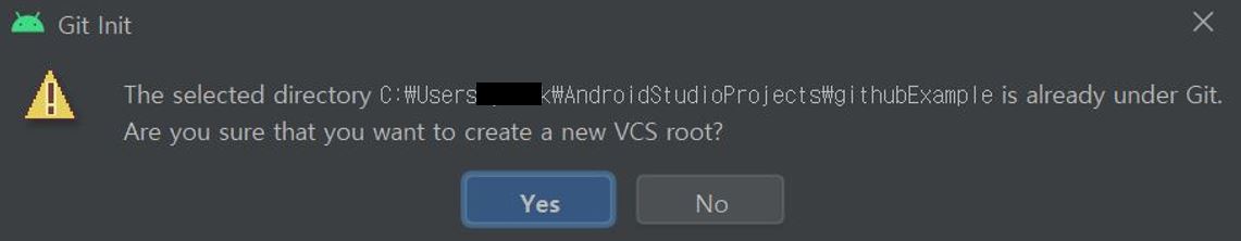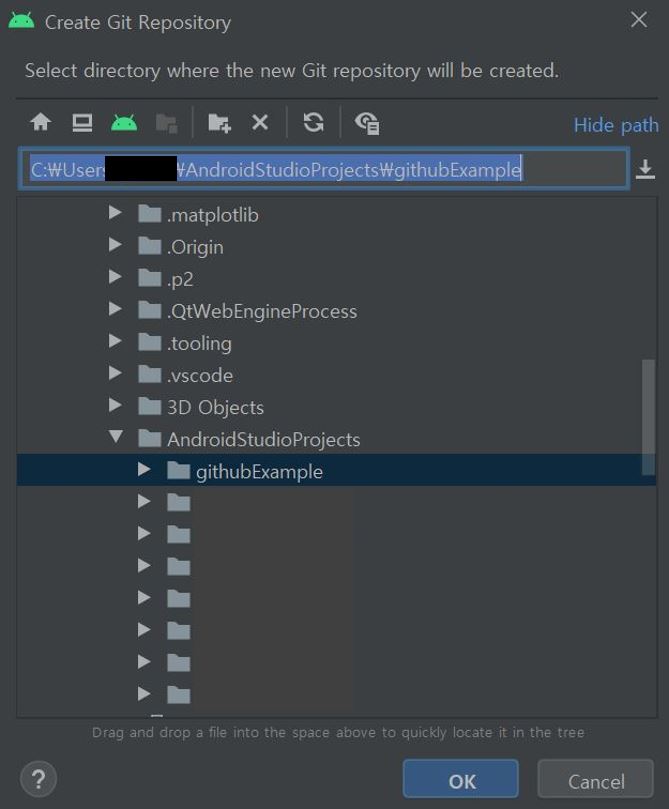 안드로이드 스튜디오 상단 메뉴 바에서 VCS > Import into Version Control > Create Git Repository 클릭. 아래와 같은 창이 뜨면 프로젝트 확인 후 OK 클릭