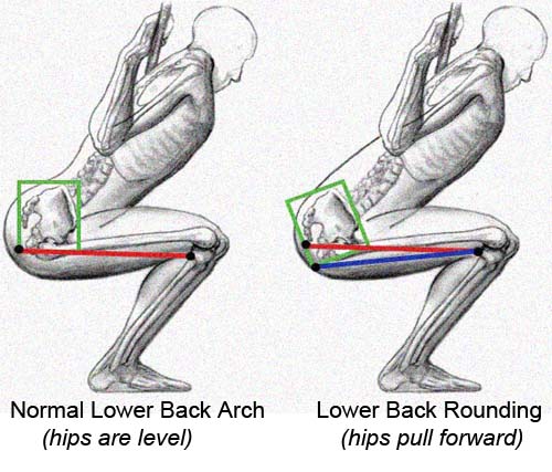 위의 사진 왼쪽에서 볼 수 있듯 정상적인 스쿼트 자세는 허리 중립이 잘 유지되며 엉덩이가 아래로 말리지 않습니다. 물론 허리가 스쿼트를 하다보면 간혹 살짝 아치형이 되는 경우도 있습니다. 이러한 경우에 허리가 너무 심하게 아치형이 되어 중량을 허리로 받지 않게끔 적당한 중립을 유지하는 것이 좋습니다. (사진과 같은 정도의 아치형이 딱 적당합니다.)